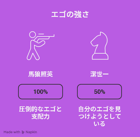 - 馬狼 照英(ばろう しょうえい/声:諏訪部 順一〈すわべ じゅんいち〉)とのエゴの対比